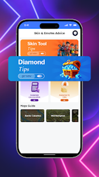 تشمل الميزات الرئيسية للتطبيق قسم نصائح الماس، آلة حاسبة للماس، نصائح أدوات الجلد، نصائح المظلات، ودليل الخرائط. من المهم التأكيد على أن التطبيق لا يعمل كاختراق أو غش للحصول على الماس؛ بل إنه يقدم نصائح مشروعة لمساعدة اللاعبين على تحسين مهاراتهم. جميع المحتويات داخل التطبيق تعود بشكل صحيح إلى أصحاب حقوق الطبع والنشر المعنيين.
